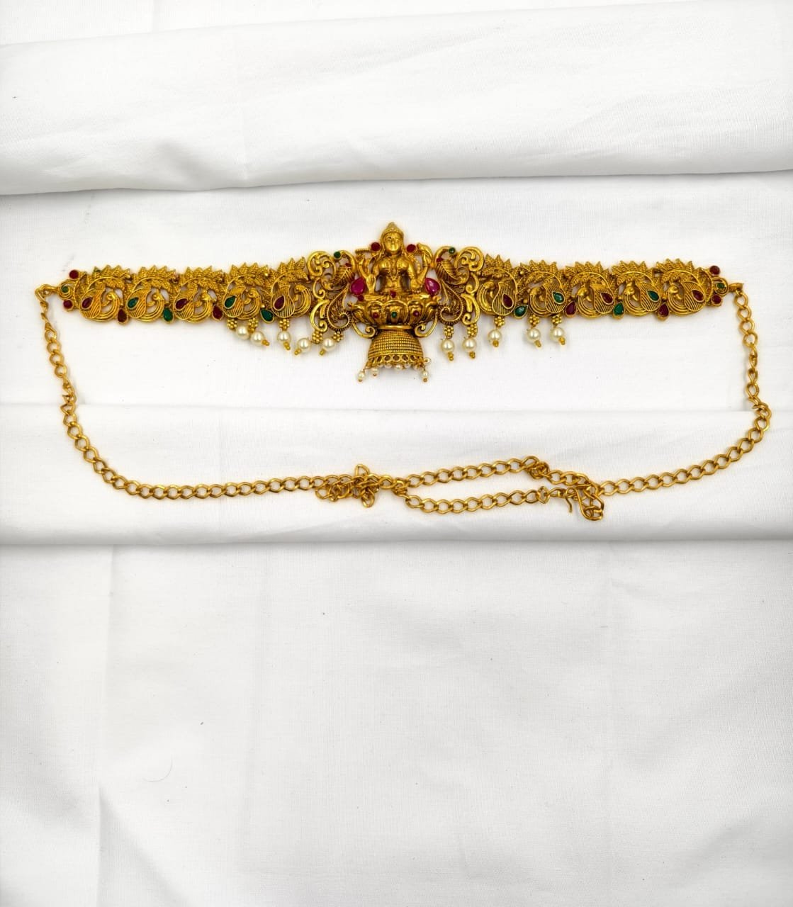 Beautiful Temple matt finish antique traditional kamarbandh with ruby & green radiant stones with white hanging pearls engraved in it to make your look perfect on your special day. Occasion:- wedding ceremony, engagement, anniversary, birthday or any any other occasion You can wear this traditional kamarbandh on any occasions & add exquisite grace to your look. Perfect gift:- Gift this stunning Traditional kamarbandh (Hip belt) for your loved ones as Birthday gift, Anniversary gift etc. Gift on any occasion women’s love for jewellery is everlasting