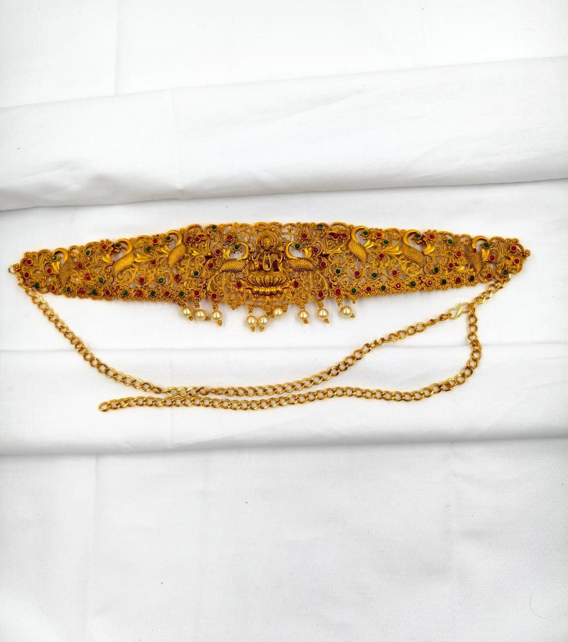 Beautiful Temple matt finish antique traditional kamarbandh with ruby & green radiant stones with white hanging pearls engraved in it to make your look perfect on your special day. Occasion:- wedding ceremony, engagement, anniversary, birthday or any any other occasion You can wear this traditional kamarbandh on any occasions & add exquisite grace to your look. Perfect gift:- Gift this stunning Traditional kamarbandh (Hip belt) for your loved ones as Birthday gift, Anniversary gift etc. Gift on any occasion women’s love for jewellery is everlasting