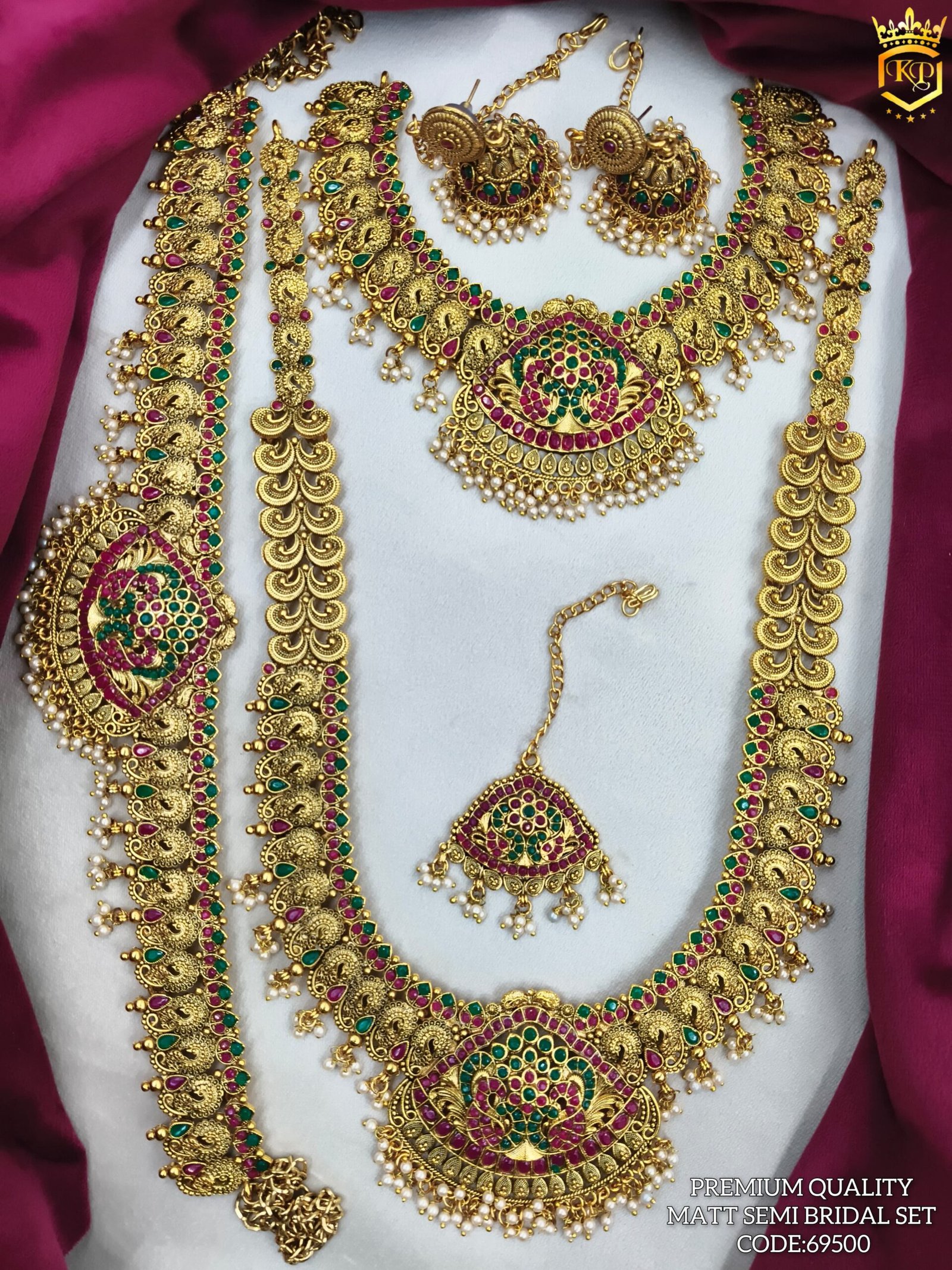 Description – Pearls embellished South Indian Matt Finish Traditional Bridal Jewelry set with beautiful stones & pearls to give you a complete traditional bridal look on your most special day.